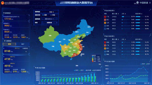 中国联通基于全国数据一点汇聚、全量人口外推算法,实现就业者群体分析、流动态势感知;常态化监测法定节假日流动及迁徙特征、就业稳定性、返乡回流等就业形势,精准勾勒“职住画像”,识别真实就业结构形态,准确率不低于 90%。相较于靠抽样调查、季度上报的传统模式,现在可以每月更新,实时精准捕捉到跨域人口流动、就业分布、结构变化。